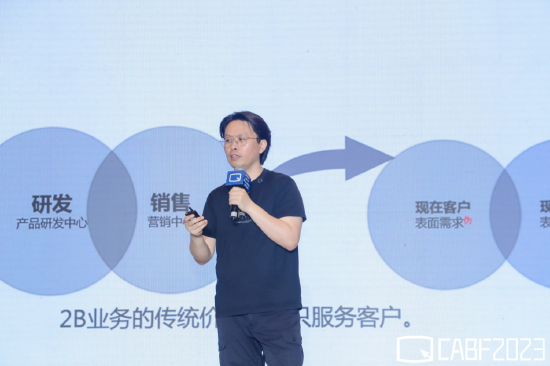什么意思呢?传统To B业务的价值链,是客户有一个表面的需求,然后我们的销售人员和研发人员,根据客户的需求,开发一款产品卖给他。这很简单,非常常规。