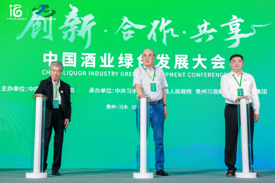 大会现场,王新国、程三知、金慧元共同开启中国酒业绿色发展“习水时间”。
