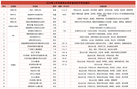 据观点指数不完全统计,2024年上半年,样本企业共计新增开业25个办公空间产品,相较去年上半年,样本企业新开项目数变动不大,但和行业快速增长阶段对比,企业规模增长速度明显放缓。