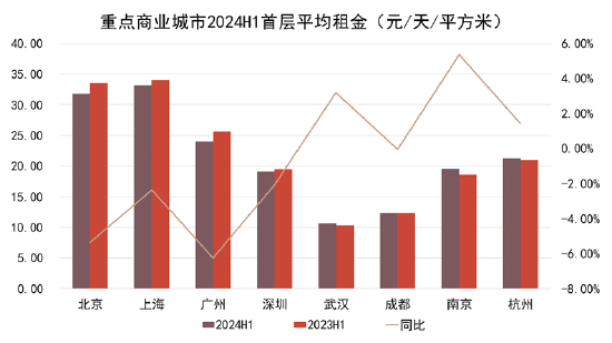 相关数据显示,2024上半年一线商业城市的零售物业首层租金均有不同程度的下滑,而二线城市虽有增长,但幅度不大。