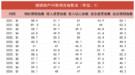 央行发布的2024年第一季度城镇储户问卷调查报告数据显示,倾向于“更多消费”的居民占 23.4%,与上季基本持平;倾向于“更多储蓄”的居民占61.8%,比上季增加 0.7 个百分点。