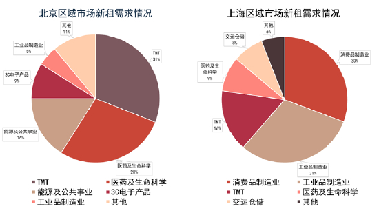 值得注意的是,不同类型子市场租金表现出现分化,这主要是由于不同行业的租户对于园区的需求不同,加之政策支持的方向也不同。目前,据北京及上海区域市场新租需求情况,可以发现TMT类的租户均在租赁需求中占据很大份额,在北京市场占比31%,上海市场占16%。
