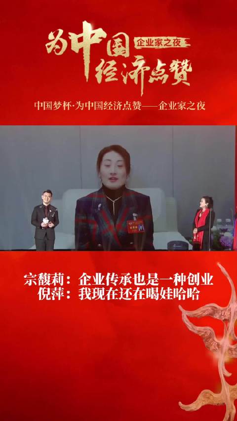 “为中国经济点赞——企业家之夜”于1月15日在北京举行。杭州娃哈哈集团有限公司董事长兼总经理宗馥莉出席接受致敬。主持人、演员倪萍,华熙生物董事长兼总裁赵燕,俏江南创始人张兰为其见证荣誉。