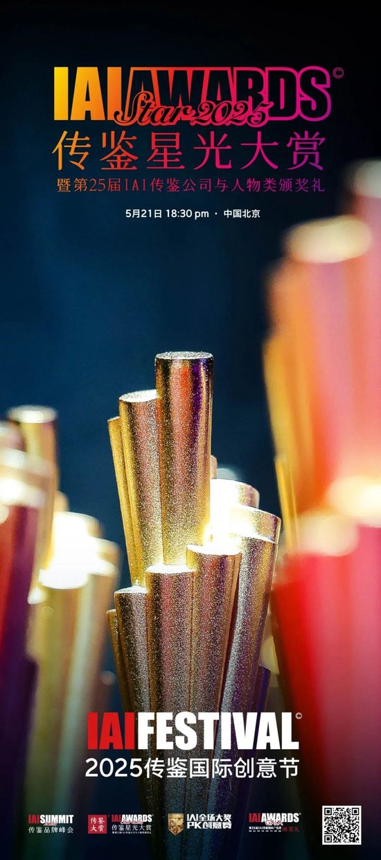 作为2025IAI传鉴国际创意节的重要组成部分,传鉴星光大赏不仅是一场典礼,更是一场创意节的“能量引爆”。它将为5月21-22日两天的峰会论坛、趋势发布、圆桌对话、全场大奖PK创意赛等系列活动,点亮第一束焦点之光。
