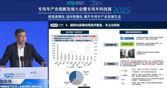 张永伟表示,在国际化发展方面,中国更有竞争力的是商用车和专用车。他介绍,2024年专用车出口量跃升至5.21万辆,出口额38.61亿美元,增幅分别为44.6%和28.7%。其中工程类专用车出口量为3.55万辆,占专用车出口量的68%。