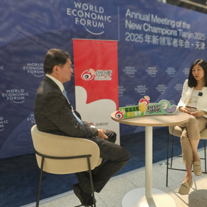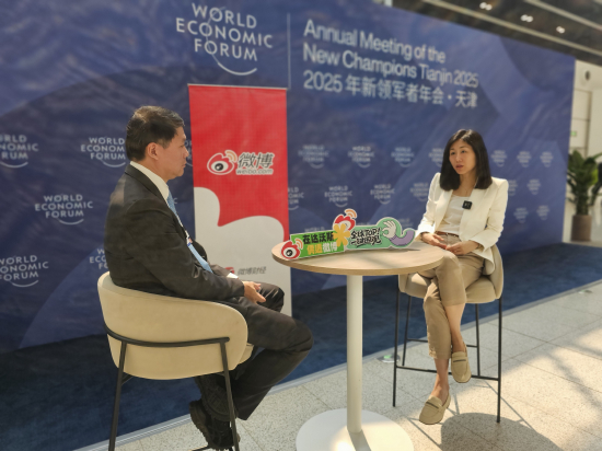 6月24日,夏季达沃斯论坛在天津举行,微博达沃斯特别主持蒉莺春在论坛现场的微博演播室对话上海交通大学上海高级金融学院金融学教授朱宁。