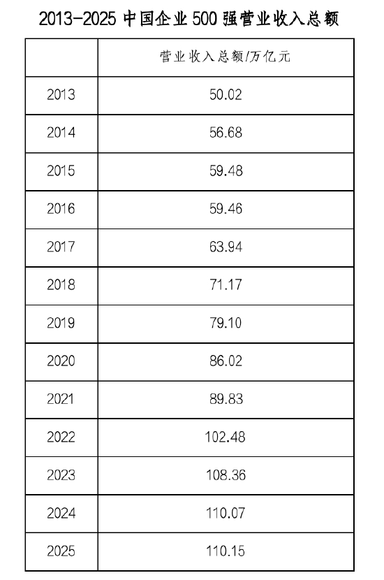 2025中国企业500强总体规模保持增长态势,营业收入总额达到110.15万亿元;资产总额为460.85万亿元,增长7.46%。