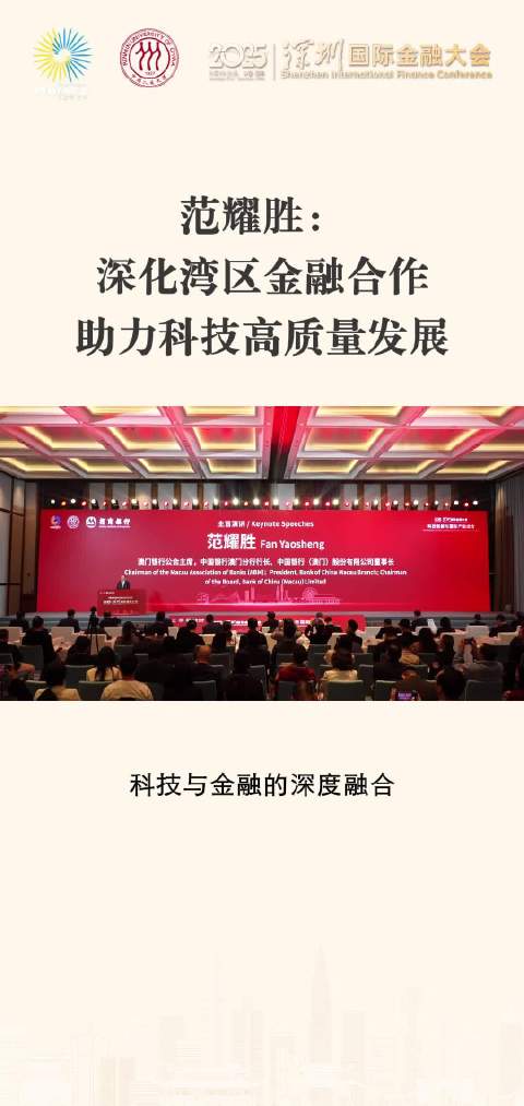 由中国人民大学主办的2025深圳国际金融大会于11月19日至21日在深圳举行。澳门银行公会主席,中国银行澳门分行行长、中国银行(澳门)股份有限公司董事长范耀胜指出科技与金融的深度融合,是连接产业链“断点”、打通经济循环“堵点”的关键。