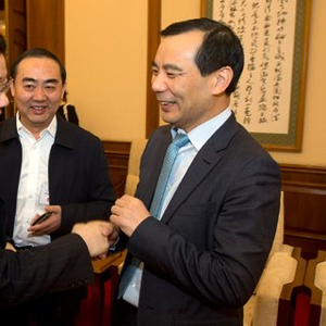 国务院发展研究中心主任李伟与安邦保险集团董事长吴小晖在“国研智库论坛.新年论坛2017”上亲切交流。