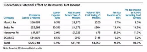 据普华永道估计,通过提高运营效率,区块链每年可为再保险业节约50-100亿美元。考虑到再保险费用在保费中占比5%-10%,区块链可进一步影响并推动保险产品的降价。