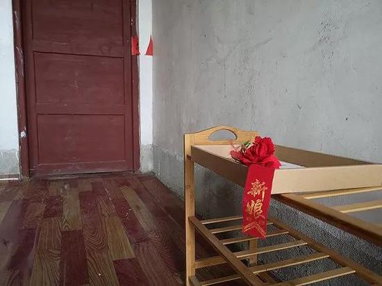 戴桂花和两个孩子的绝大部分遗物已经烧掉,她生前居住的房间内遗留着一朵新娘胸花。摄影:翟星理