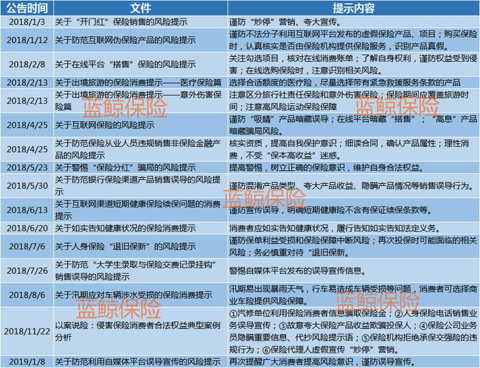蓝鲸保险梳理发现,2018年以来,监管共发出16份风险提示,从保险产品销售误导、违规“搭售”等多方面对消费者进行风险提示,同时要求市场主体规范行为。