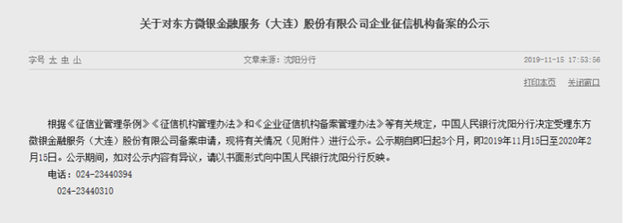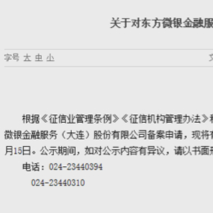 值得一提的是,同为东方微银董事长潘晓冬控制下的东方微银金融服务(大连)股份有限公司,在今年11月15日获得中国人民银行沈阳分行征信机构备案公示,若备案成功,将意味着东方微银关联公司将获得征信牌照。