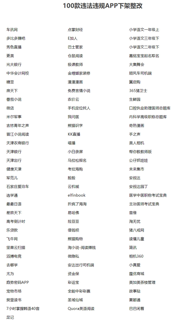 12月5日,公众号“国家网络安全通报中心”发布通报称,11月以来,全国公安机关网安部门按照公安部网络安全保卫局的部署要求,集中发现、集中侦办、集中查处整改了100款违法违规APP及其运营的互联网企业。