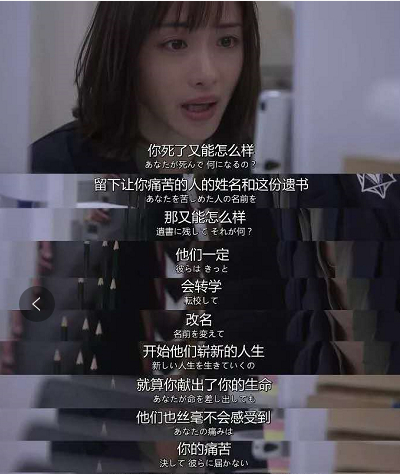 “将来你们只会说我怎么不记得,我怎么不记得我把红墨水丢到她身上,我就是闹着玩儿的呀,开玩笑的.....你们之后的日子舒舒坦坦,没有一点心理负担,你们回首自己的人生,觉得自己挺好的了....你们动手的没动手的都一样,你们比石头还冷漠,你们又恶毒又愚蠢,你们胆小怕事,别人做什么你就跟着做什么,你们巴不得世界上多死一个人,因为你们日子真的无聊,因为你们觉得自己不会承担任何后果。”《悲伤逆流成河》