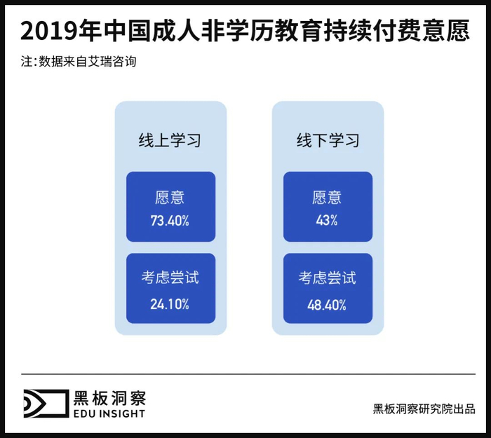 根据艾瑞咨询数据,线下成人非学历教育愿意持续付费的用户比例接近43.0%,而在线上端,愿意持续付费的用户比例提高到了73.4%,成人教育市场不容小觑。在一众赛道玩家中,更为我们熟知的多是非学历在线成人教育平台,因此我们讨论的也主要是该模式。