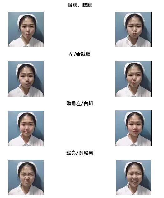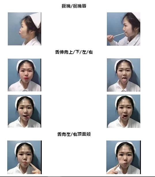 出现口角歪斜,言语含糊,吞咽困难的患者可做以下运动,每个动作保持5-10秒,重复10次。