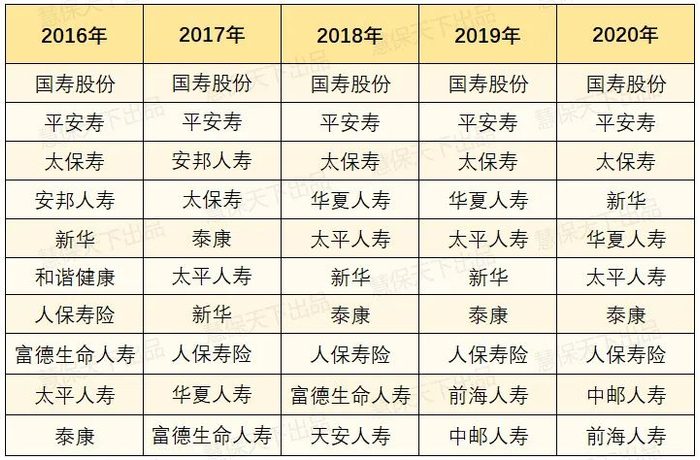 到2016年,太保仍稳居第三之位,但是新华已经滑落至第五位,泰康更是滑落至第十名,险些跌出前十名。
