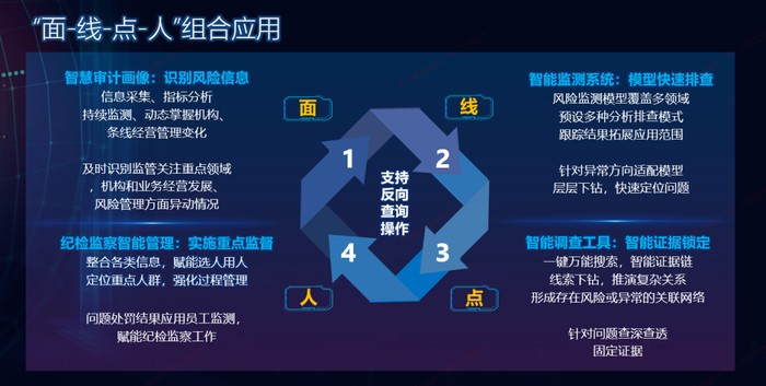 创新适配平安特色,全面支撑审计转型。平台创新建设具有平安特色的稽核监察线上化作业场景,通过打造四大核心组件,形成平安银行稽核监察工作所特有的“面-线-点-人”组合应用,构建风险识别、模型排查、固定证据、重点监督的闭环工作流,支持传统审计向持续审计新模式转型,提升对风险的前瞻预判、动态跟踪、敏捷排查、远程锁定能力。