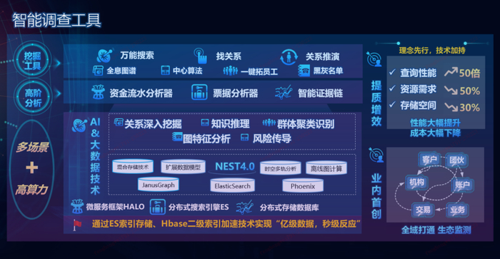 挖掘科技应用场景,精心打磨审计“利器”。“稽核监察慧眼平台”吸纳了多项先进金融科技能力:借助知识图谱和关系网络等技术,建设了业内领先的智能调查工具,针对错综复杂的关联关系网络,精准发掘其中的隐性关系,进而抽丝剥茧、快速锁定关键证据,单户业务样本的查证效率提升约5倍,有效解决审计取证的“最后一公里”难题;运用大数据、人工智能技术和算法,构建了业内首创的审计画像应用,呈现审计视角多维画像信息,支持用户开展指标分析建模,并辅助生成制式化报告,提升持续跟踪、动态检视能力;依托大数据分析技术,支持用户开展敏捷建模,已积累500+规模的风险监测模型库,由系统自动开展预警监测,大幅提升远程审计效率;针对百亿量级的审计大数据,借助分布式存储及多级索引技术,实现前端核心应用的“亿级数据、秒级响应”。