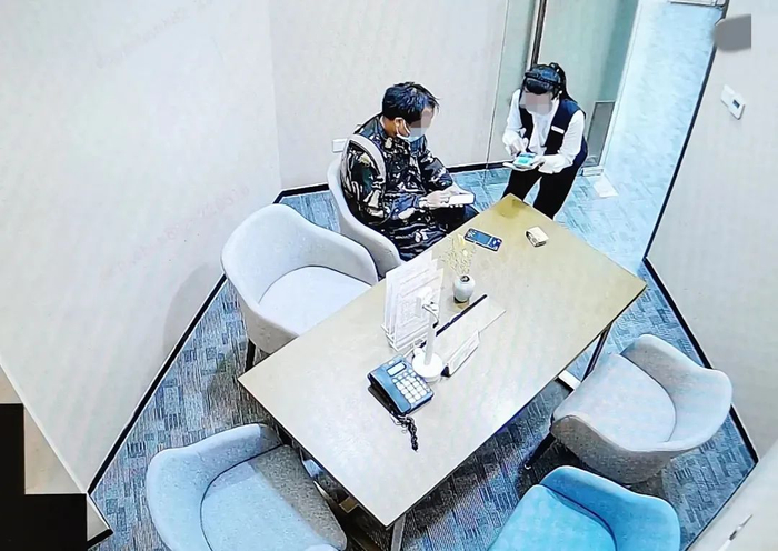 意识到客户遇到了电诈威胁,工作人员镇定地引导客户到安全的贵宾区洽谈室单独咨询,并通过手机打字的方式与客户沟通,力求全面了解其处境。了解得知,客户被3名持刀歹徒挟持到营业网点办理取现或转账业务,他们开一辆灰色面包车逗留在网点附近,要求客户一直保持手机通话,并警告不得报警!