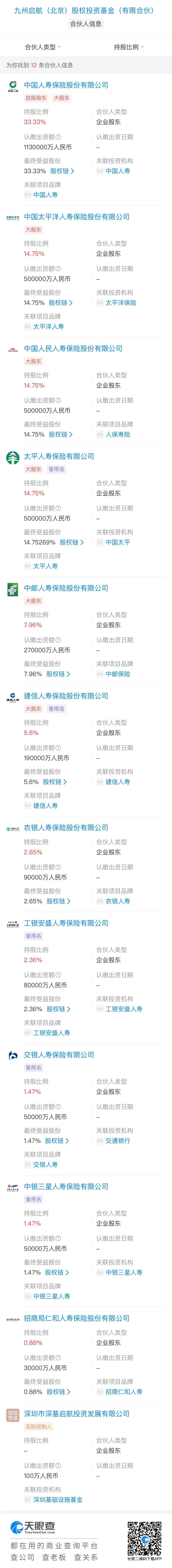 九州启航基金出资人共计12家,除执行事务合伙人跟投外,还有11家国资寿险公司:中国人寿、太保寿险、太平人寿、人保寿险、招商局仁和人寿,以及工银安盛人寿、建信人寿、农银人寿、中银三星人寿、交银人寿、中邮人寿等六大银行旗下的寿险公司。