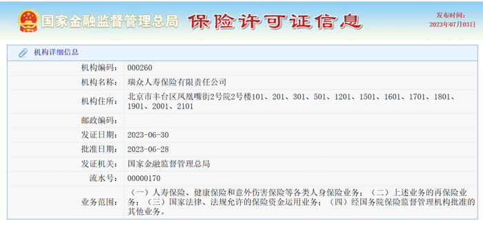 7月3日,金融监管总局官网正式发布瑞众人寿保险许可证信息。随后,又发布了《国家金融监督管理总局关于瑞众人寿保险有限责任公司及其分支机构开业的批复》,同意瑞众人寿保险有限责任公司开业,同时批准瑞众人寿保险有限责任公司筹建661家分支(专属)机构,并准予开业,同时明确瑞众人寿接受北京银保监局的属地监督管理。
