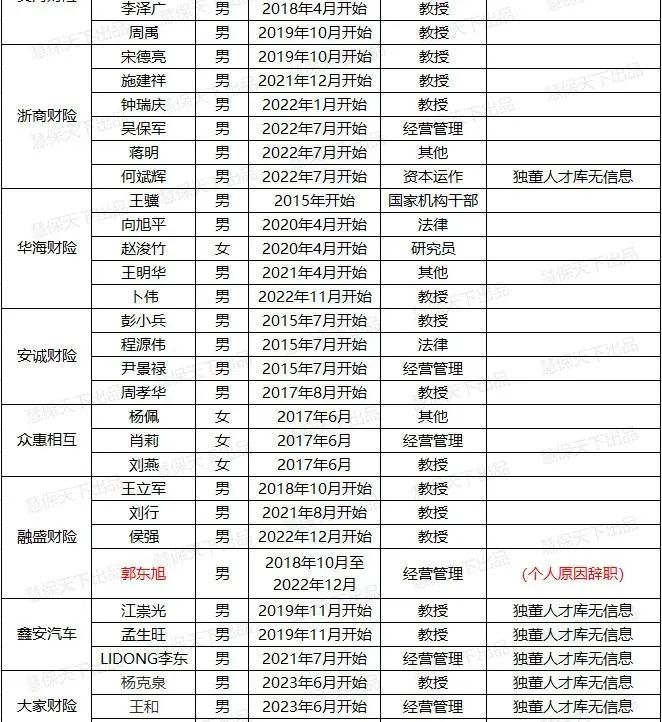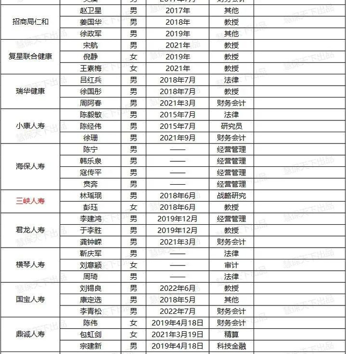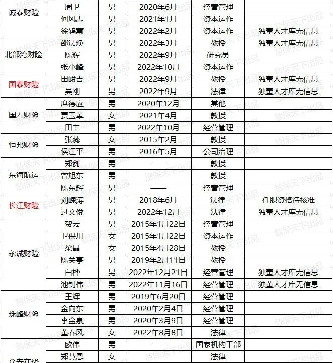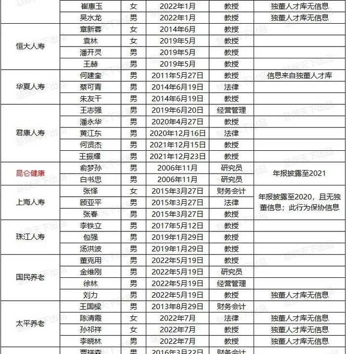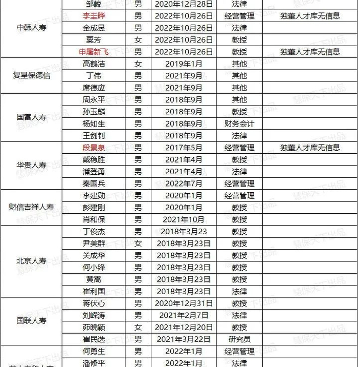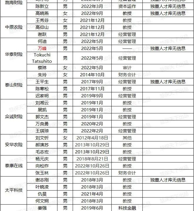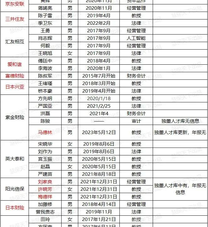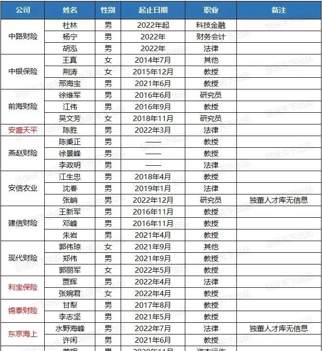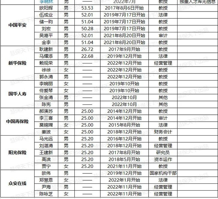 注:由于保险公司年报、官网与独董人才库信息存在出入,慧保天下以各公司官网和最新年报信息为准,辅以独董人才库进行核校。