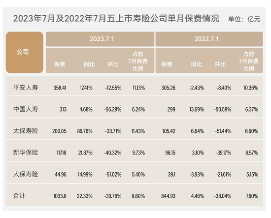 7月份5家A股上市寿险公司的保费总额1033.6亿元,环比6月份保费总额1715.77亿元,下降了39.76个百分点。