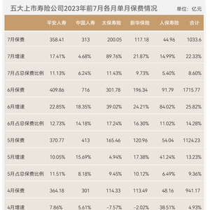 对照2022年的保费收入环比亦类似,2022年7月,平安人寿、中国人寿、太保寿险、新华保险、人保寿险的保费收入分别为305.26亿元、299亿元、105.42亿元、96.15亿元、39.1亿元,其环比2022年6月分别下降了8.4%、50.58%、51.44%、39.17%、21.61%。