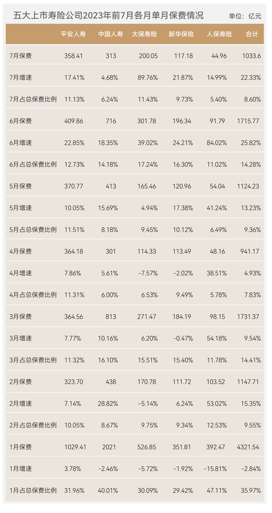 2023年7月,国寿寿险、平安人寿、太保寿险、新华人寿、人保寿险这五家A股上市公司单月保费仍同比猛增22.33%,相比2022年这一数字仅为4.48%,并且虽然这五家公司7月总保费是前7月单月保费排名倒数第二,但增速却是全年这几个月第二高的一个月,反映出营销端的持续发力。
