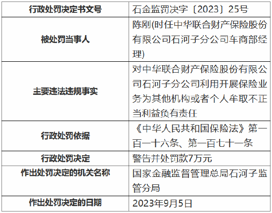 其员工陈刚对中华联合财产保险股份有限公司石河子分公司利用开展保险业务为其他机构或者个人牟取不正当利益负有责任,受到警告并处罚款7万元。