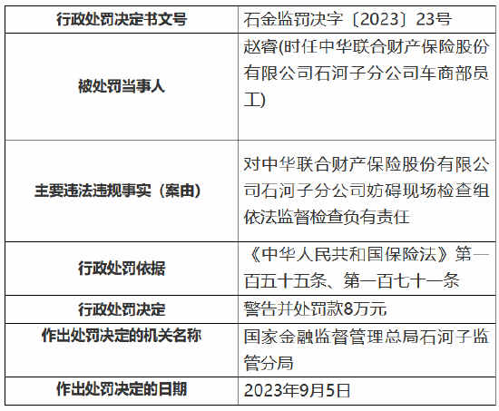 其员工赵睿对中华联合财产保险股份有限公司石河子分公司妨碍现场检查组依法监督检查负有责任,受到警告并处罚款8万元。