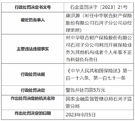 其员工康洪源对中华联合财产保险股份有限公司石河子分公司利用开展保险业务为其他机构或者个人牟取不正当利益负有责任,受到警告并处罚款5万元。