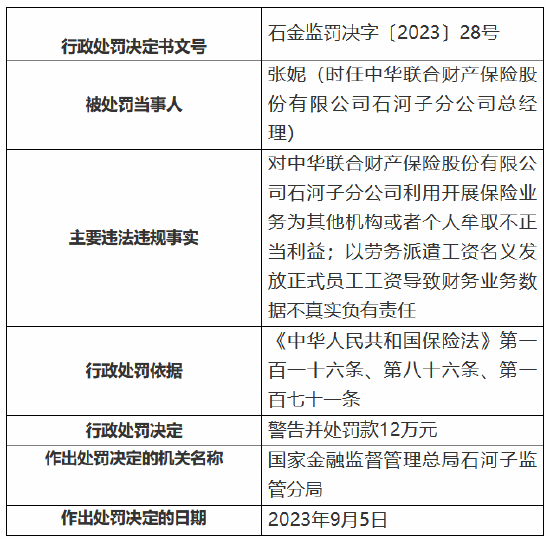 其员工张妮对中华联合财产保险股份有限公司石河子分公司利用开展保险业务为其他机构或者个人牟取不正当利益;以劳务派遣工资名义发放正式员工工资导致财务业务数据不真实负有责任,受到警告并处罚款12万元。