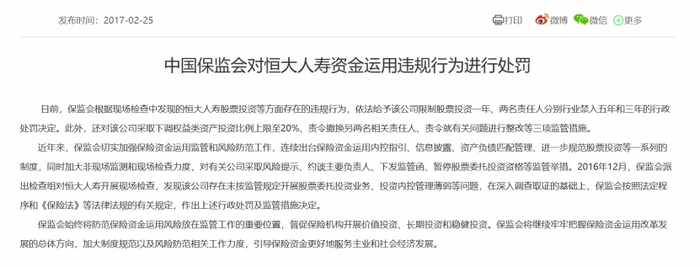 据原保监会行政处罚文件显示,由于恒大人寿违规运用保险资金的行为,限制恒大人寿股票投资业务一年,并给予两位责任人行业禁入5年和3年的严厉处罚。