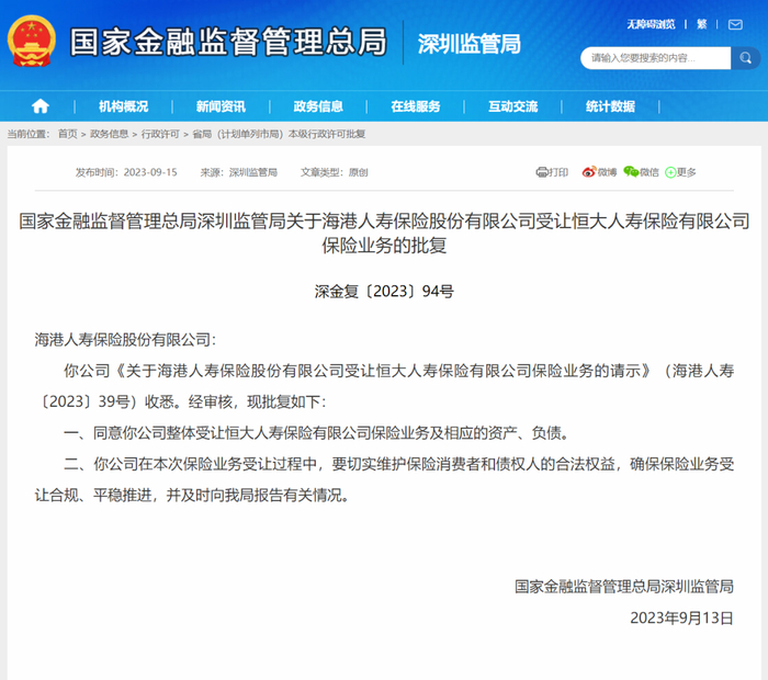 与此同时,金融监管总局深圳监管局发布《关于海港人寿保险股份有限公司受让恒大人寿保险有限公司保险业务的批复》,明确由海港人寿整体受让恒大人寿保险业务及相应的资产、负债。