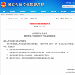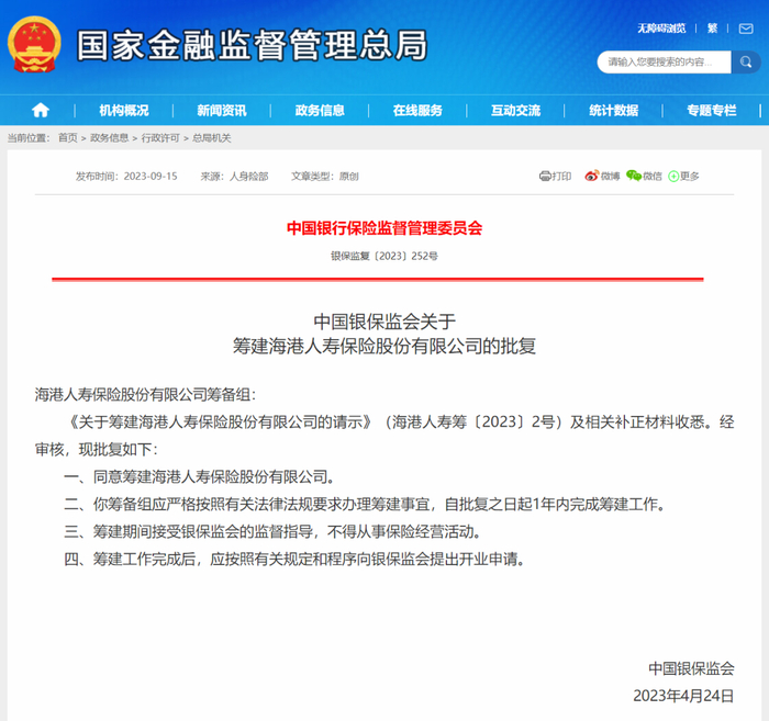 9月15日下午,金融监管总局官网同时发布《中国银保监会关于筹建海港人寿保险股份有限公司的批复》以及《国家金融监督管理总局关于海港人寿保险股份有限公司及其分支机构开业的批复》,批筹与批准开业在同一天揭晓。