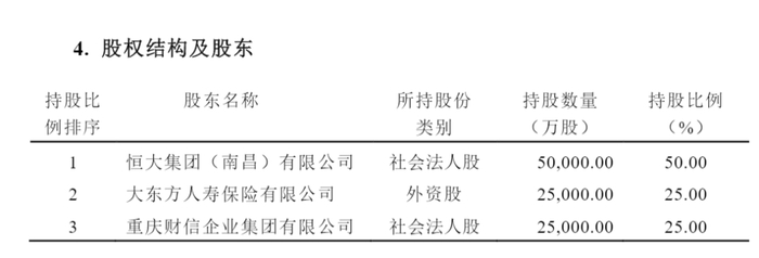 并列第三大股东为重庆市渝新投资有限公司,同样是为国有独资企业,大股东为重庆市地产集团(系恒大人寿前身、原中新大东方人寿的中方股东),许可项目为以自有资金从事投资活动、投资管理等,同样成立于2023年3月。