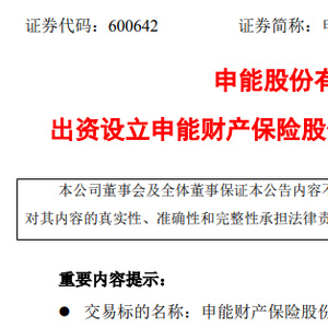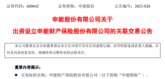 9月21日,申能股份有限公司发布《关于出资设立申能财产保险股份有限公司的关联交易公告》(以下简称《公告》)显示,申能集团旗下两子公司共出资50亿元,合计占股50%。