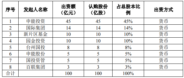各方均以货币认购股份,每股认购价为人民币1元。申能投资是公司的控股股东。