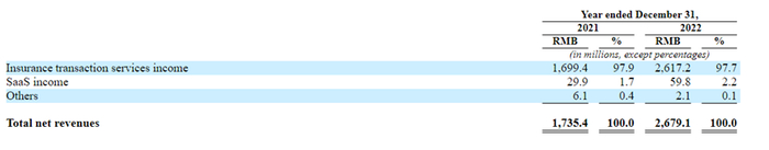 从具体的业务构成来看,车车的大部分收入来自其平台上的保险交易,特别是汽车保险交易。具体来看,其净收入包括保险交易服务收入、SaaS收入两大板块,2021年和2022年,车车的保险交易服务收入分别16.99亿元和26.17亿元,占总收入的97.9%、97.7%;SaaS服务收入则分别为2990万元、5900万元,仅占总收入的1.7%、2.2%。