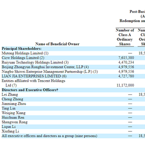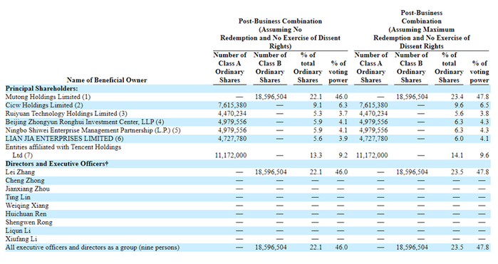 从车车招股书披露的股权结构来看,车车主要股东包括中云融汇、腾讯、华融实业等投资机构。其中,车车创始人兼CEO张磊拥有车车22.1%的B类普通股,保有47.8%投票权,为第一大股东;腾讯持有车车13.3%的A类普通股,有9.2%的投票权,为第一大外部机构股东。
