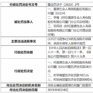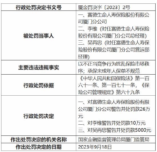 9月27日金融一线消息,国家金融监督管理总局厦门监管局行政处罚信息公开表显示,富德生命人寿保险股份有限公司厦门分公司以不正当竞争行为扰乱保险市场秩序;承保未成年人保单不规范,被处以警告并处罚款26万元。