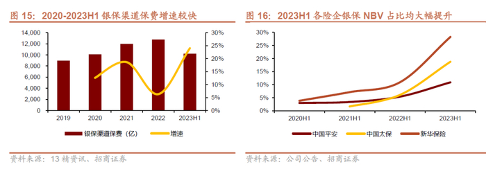 银保渠道方面,近期监管要求严格落实“报行合一”,根治费用乱象,有望推动行业回归理性竞争。近年来,在客户储蓄需求提升、保险公司转移业务压力发力银保渠道、银行提高中收需求迫切三方面共同驱动下,银保渠道再次步入上升通道,2020-2022年行业银保渠道保费CAGR达12.3%,2023上半年同比增长则高达24%,规模和增速均是近年来最高。