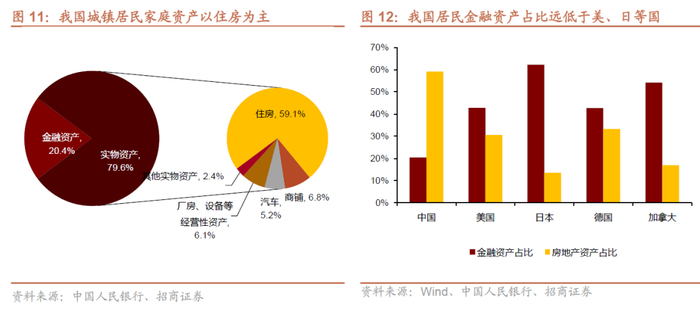 随着内外部环境变化,当前居民尤其是高净值人群的资产面临再配置且风险偏好进一步降低,稳健理财诉求日益凸显。长期以来我国居民资产配置过度依赖不动产,理财配置偏好相对保守且主要集中在存款类产品,2019年央行《中国城镇居民家庭资产负债情况调查》显示,我国城镇居民家庭资产以实物资产为主,住房占其中比例超七成,远高于美、日等国的平均水平,金融资产占比较低仅为20.4%且主要集中在银行存款类资产。