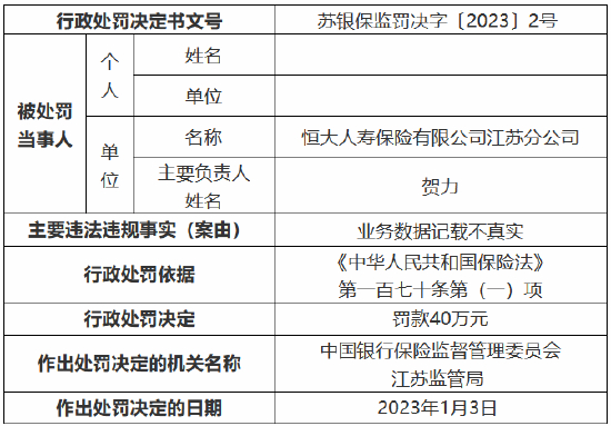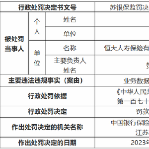 因业务数据记载不真实 恒大人寿江苏分公司被罚40万元