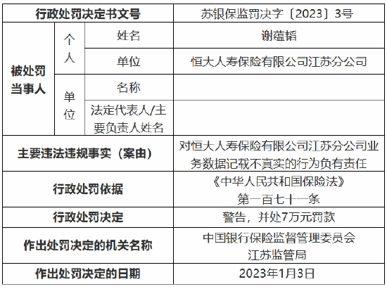 1月11日金融一线消息,江苏银保监局行政处罚信息公开表显示,恒大人寿保险有限公司江苏分公司因业务数据记载不真实,被罚款40万元。时任员工谢蕴韬对此事负有责任,受到警告,并处7万元罚款。