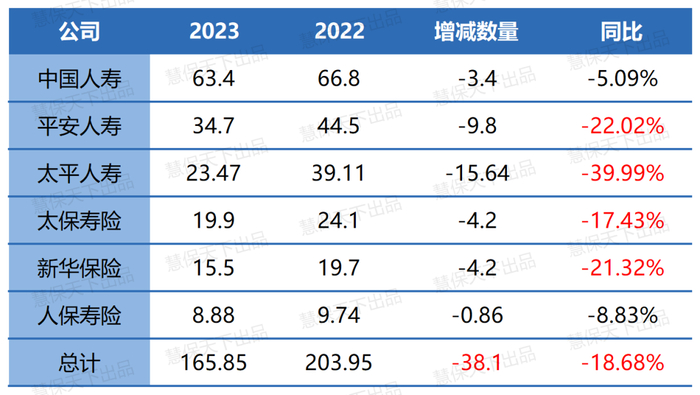 据上市险企披露的数据,2023年,国内6家主要上市寿险公司代理人数量相较上一年再减38万,已经从2022年的203万人,下滑至165万人,减少了近两成,而相比2019年末六家主要上市寿险公司合计达485万的总人力,已经跌去66%。