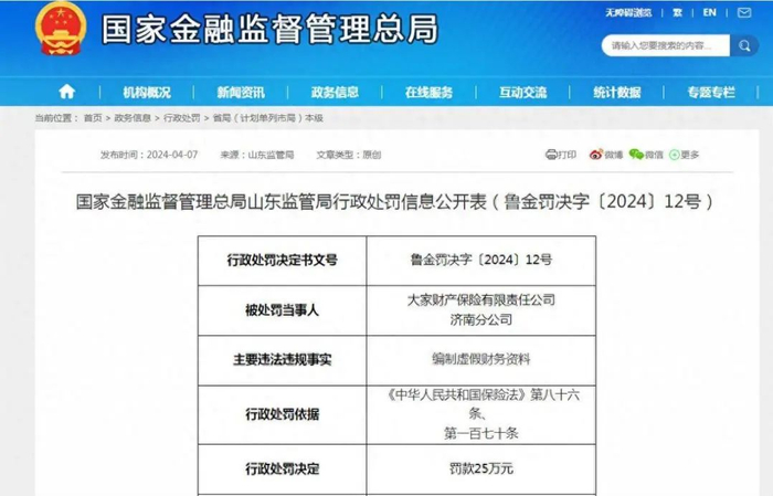 4月7日,根据国家金融监督管理总局山东监管局公布的行政处罚信息公开表“鲁金罚决字〔2024〕12号”显示,因编制虚假财务资料,大家财产保险有限责任公司济南分公司被国家金融监督管理总局山东监管局罚款25万元。